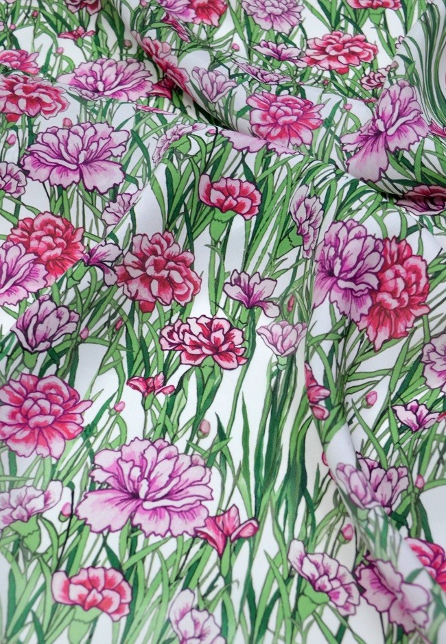 Шелковая ткань с другими типами материалов в шитье. Натуральные или искусственные ткани используют в своих работах известные модельеры задающие тренды модной индустрии. Если Вы хотите пошить молодежный наряд используйте Шелк CDC принт гвоздики предварительно выбрав расцветку, рисунок, состав ткани из представленных в нашем каталоге.